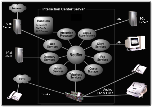 The Customer Interaction Center platform is composed of software components, called subsystems. These components are written in the C++ language to maximize performance. Individual subsystems work together via a central communication hub known as the Notifier. Each subsystem is critical to the overall system, but operates independently.