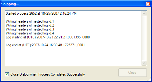 The Snipper Monitor dialog box appears when logs are being snipped or merged. It displays status information as work is performed. This is useful when large logs are processed.