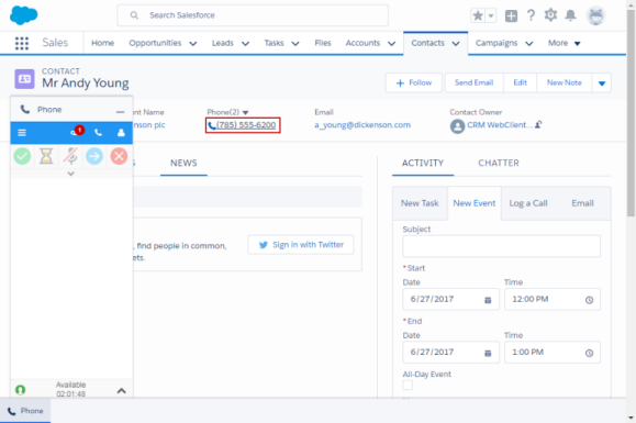 Any phone number in Salesforce displays as a click-able link that places the call immediately when clicked and auto-associates that Salesforce record (for example, contact, lead, or account) to the call log, where applicable.