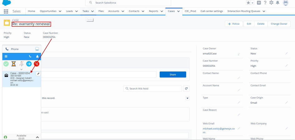 PureConnect for Salesforce supports the email-to-case feature in Salesforce using the Salesforce Object Routing Connector. The Salesforce Object Routing Connector is a separate product that automatically routes emails to the appropriate queue using CIC’s ACD engine. Agents cannot respond to emails within the softphone itself.