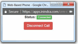 Note: Use the Web-Based Phone dialog box to monitor the connection status of your WebRTC phone. Use the PureConnect for Salesforce menus and call controls to perform standard call control operations such as making, picking up, transferring or disconnecting calls. However, you can use the Disconnect Call button in the Web-Based Phone dialog box to disconnect a call. This is similar to hanging up a physical phone to end a call. This additional method of disconnecting a call is useful if PureConnect for Salesforce becomes unavailable during a switchover.