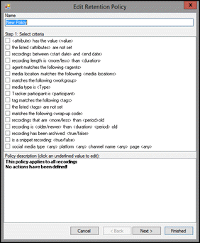 Use this page of the Edit Retention Policy dialog to select retention criteria for a recorded interaction. The criteria that can be selected to retain a recorded interaction are: