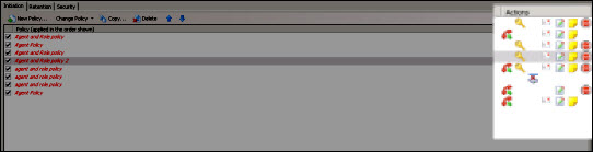 The Policy pane displays the Initiation Policies in the order in which they are applied. Use the Policy pane to change the configuration of a policy, duplicate a policy, delete a policy, change the order in which policies are applied, and quickly view the Actions that are executed by an Initiation Policy.
