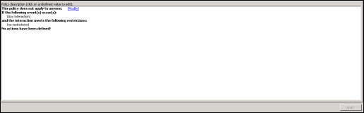 If an action is not defined for a Policy, a warning message is displayed when you are creating the Policy. If no actions are defined for a Policy, an ERROR message is displayed in the Policy Editor status bar.