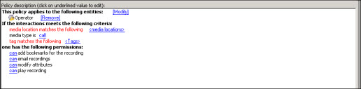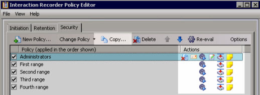Use the Interaction Recorder Policy Editor Security page to create a New Policy to specify which actions specific users are allowed to perform on selected recordings. Security policies apply to Agents and Roles.