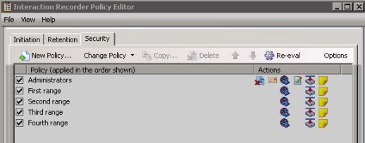 Policies are re-evaluated from top to bottom when an interaction is completed and de-allocates. When you make a change to a Security Policy you can immediately re-evaluate the policy by clicking Re-eval on the toolbar. For the Re-eval button to be available, all policies need to be saved. On the Re-evaluate security policies dialog, select which recordings to apply security policies to.