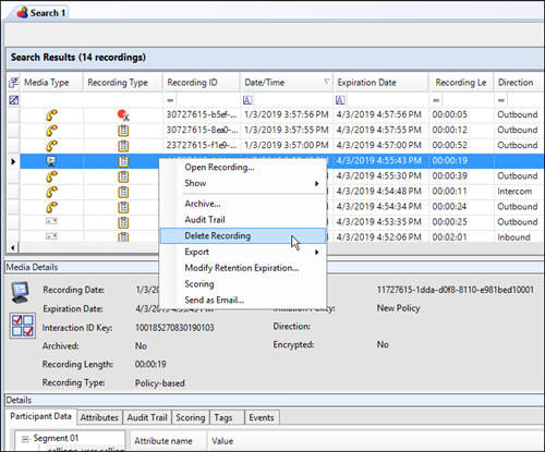 Use the Search Results View to delete a recording. When a search is run, a list of recorded interactions is displayed in a grid in the Search Results View in the Workspace.