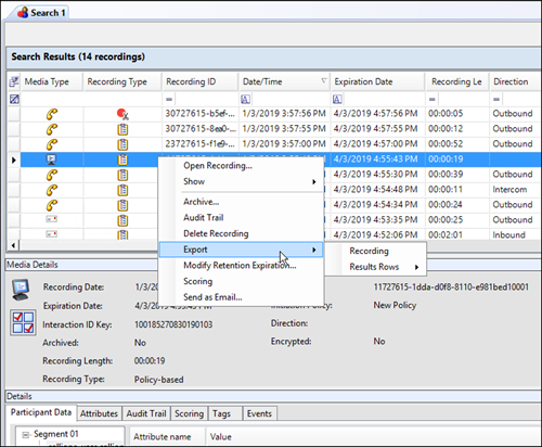 Note: To export recordings in IC Business Manager, a user must have permission for the Security Policy can export/archive recordings.