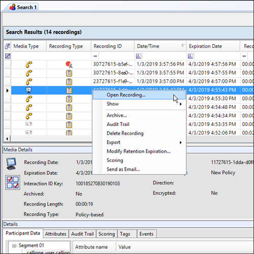 From the Search Results View, select a recorded interaction in the Recordings grid.