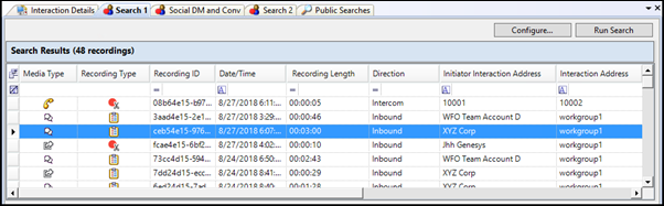 Based on the attributes of the recording search, when a search is run the results are displayed in the Search Results view in the Workspace. A list of recorded interactions is displayed at the top of the Workspace in a grid, which gives details of the interaction.