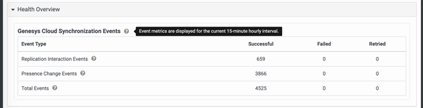 This section displays metrics around the Genesys Cloud Synchronization Events for replicated interaction and presence change events between PureConnect and Genesys Cloud.