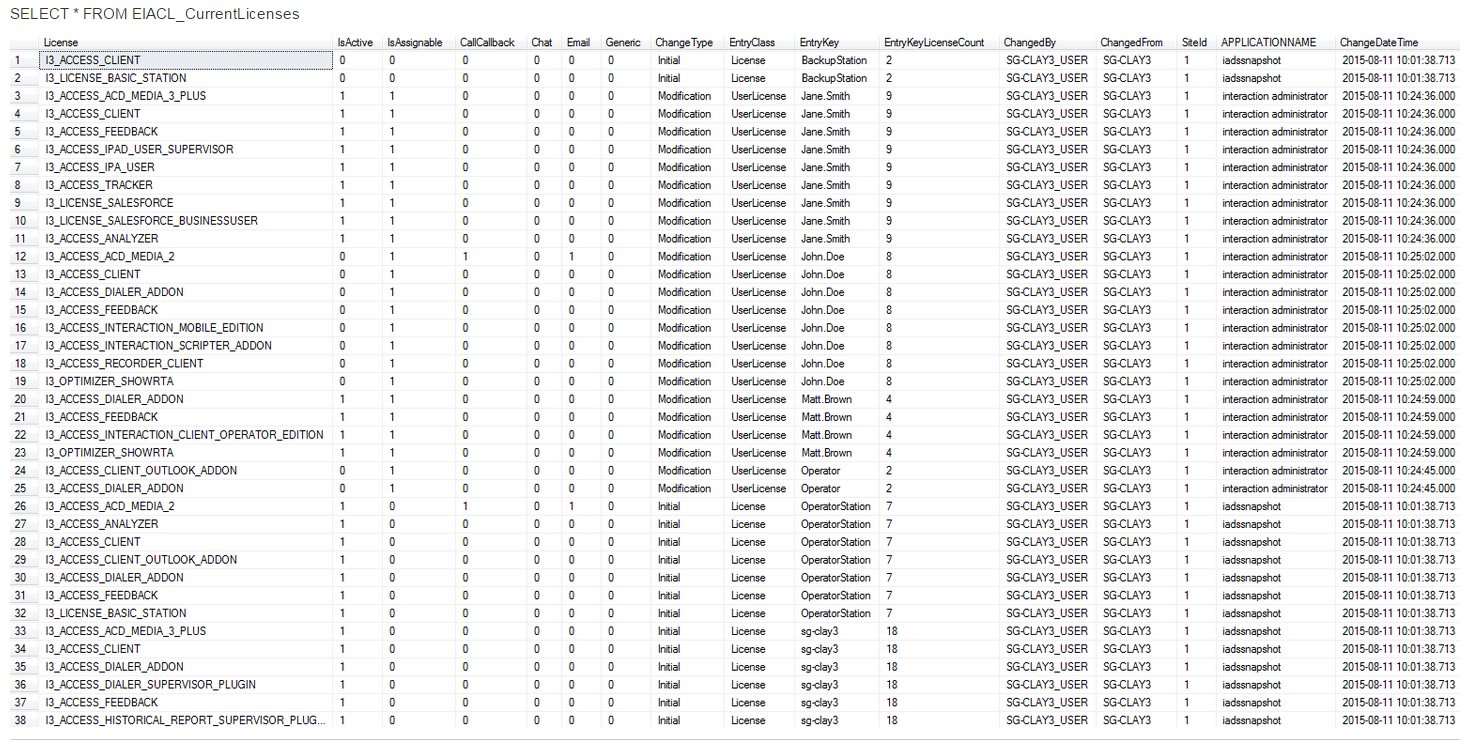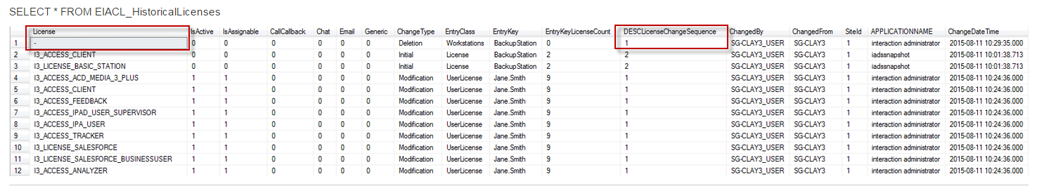 When a user or station is deleted, the most recent entry for that entry key shows a - in the license column and a 1 in the DescLicenseChangeSequence column. This provides an easy way to tell which licenses were allocated to the user or station when the user or station was deleted, in case you need to recreate the user or station later with the same licenses.