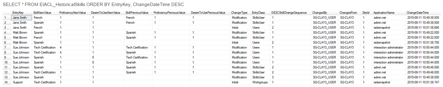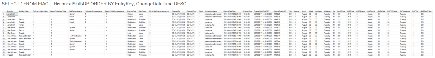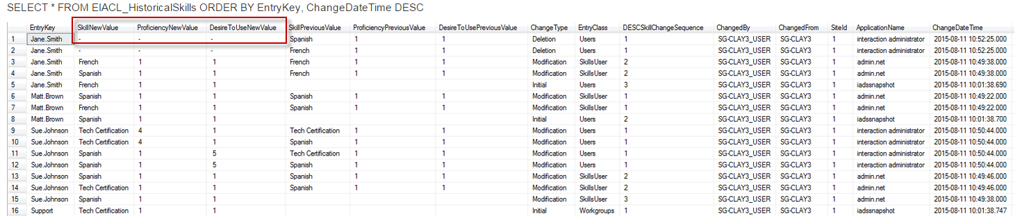 When a user or workgroup is deleted, the SkillNewValue, ProficiencyNewValue and DesireToUseNewValue columns display a -. This provides an easy way to tell what skills were allocated to a user or workgroup when it was deleted in case you need to recreate the user or workgroup later with the same skill allocations.