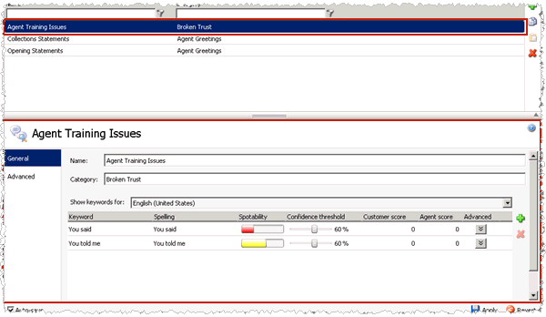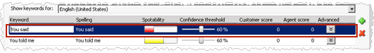 To modify a keyword in this keyword set, click the Keyword to modify and make your changes. For more information, see Setting the Confidence Threshold for a Keyword and Set the Score for a Keyword.