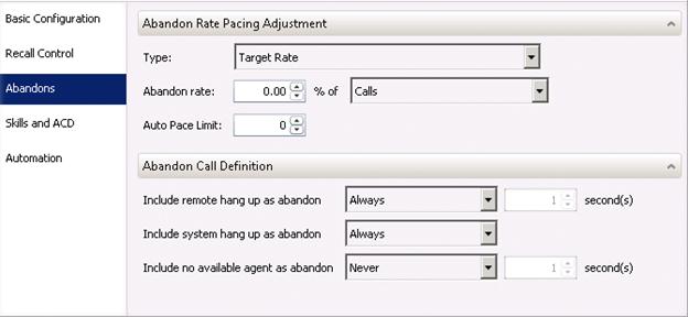 Settings on the Abandon Call Definition expander specify what a campaign considers an abandoned call to be.