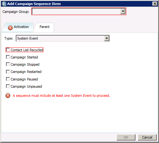Once you have configured the Activation, select the Parent tab and choose a parent campaign sequence item.