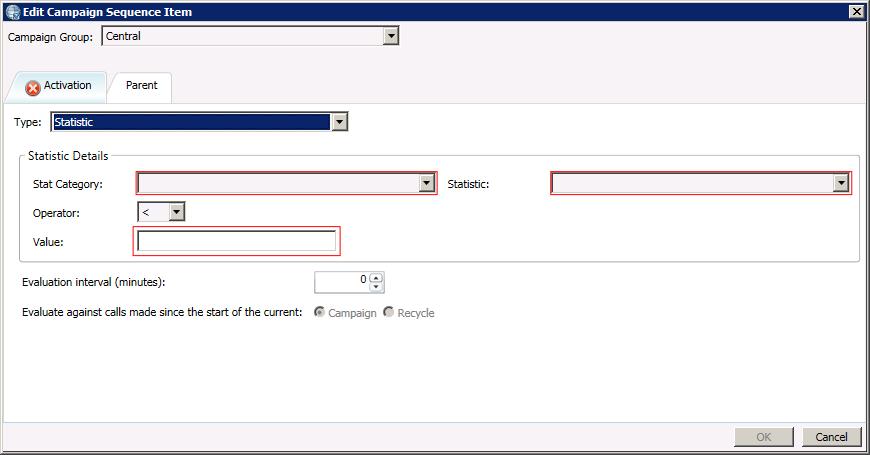 A Statistic activation type functions similarly to a statistic rule. A statistic type compares the run time value of a statistic to a user-defined value configured in the campaign sequence item.