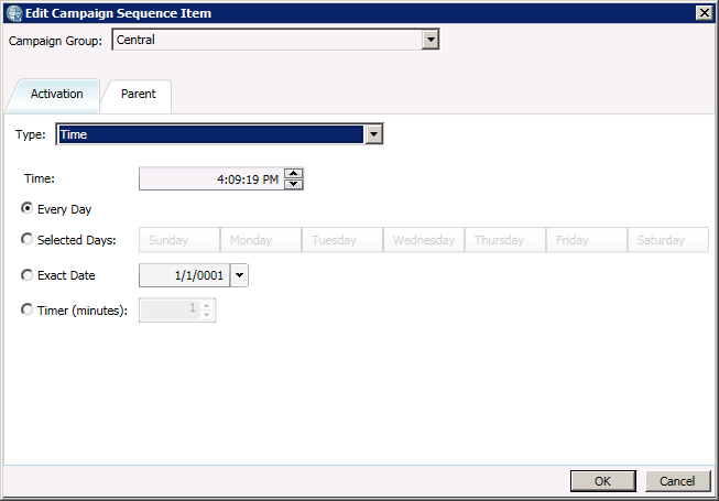 A Time activation type triggers a campaign sequence transition when the specified time occurs.