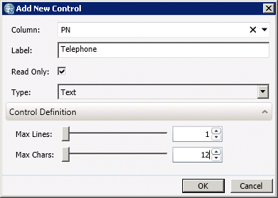 Selects the Type of user interface control to display the database column in. Your choices are DateTime, Drop List, Numeric, Radio Box, and Text. Based on your selection, different options appear under Control Definition: