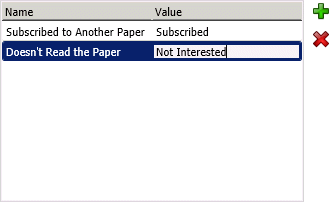 Prompts for a collection of Name/Value pairs. Name is the item that will appear in the drop list. Value is the value returned to the column.