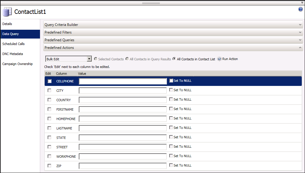 When you select Bulk Edit as a Predefined Action, you'll see a grid showing a list of all the columns that make up a record in the contact list. You can then edit the values for any field in the selected records.