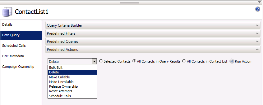 You'll use the controls in the Predefined Actions section to modify contact list records that you specify in the Query Results grid. This is a powerful feature, so use it carefully.