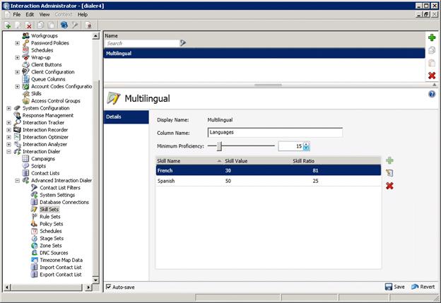 Interaction Dialer campaigns can be configured to perform skills-based routing. By ensuring that correctly skilled agents are available prior to initiating any outbound calls, the Interaction Dialer solution is perfect for state-based licensing campaigns, language requirements, contact optimization, selling and collections specialties, and many other applications.