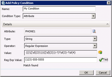 This expression searches for a pattern that has at least seven digits, optionally including dashes and an area code, with parentheses around the area code optional as well. In a pre-call Policy Condition for example (see figure below), the phone number (123)-555-5555 is a match for this expression, so the condition is satisfied.