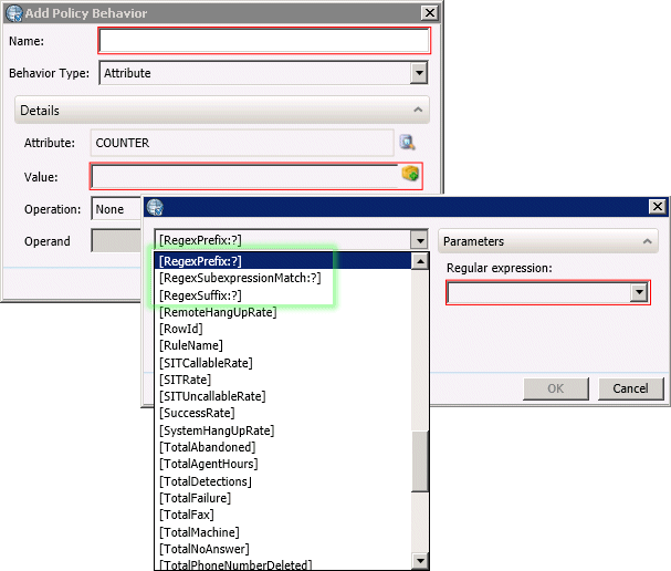 For Policy Behaviors, three macros correspond to the regular expression condition. To select these macros, create a Policy Set Item Behavior, and then click the Macros button to open the Macro dialog. (For more information, see the Macros topic.)