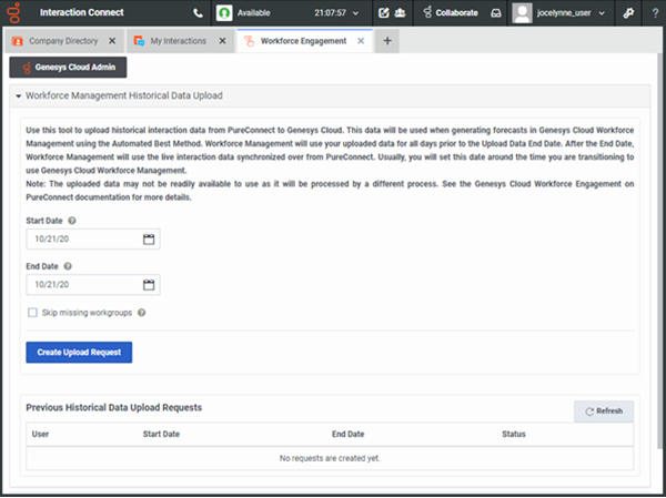 In the Workforce Engagement view in Interaction Connect, expand the Workforce Management Historical Data Upload section.