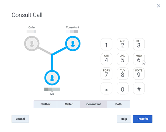 Note: This creates a conference call. You can now speak to both the Caller and the Consultant. If you later complete the transfer, the conference call is replaced by a standard two-party call.