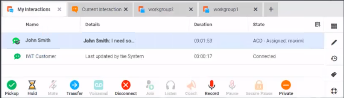 Chats initiated by Genesys Predictive Engagement appear in the Interaction Connect My Interactions view, just like PureConnect web chats. Predictive Engagement chats enable agents to display journey map information in the Predictive Engagement view. For more information, see Predictive Engagement view.