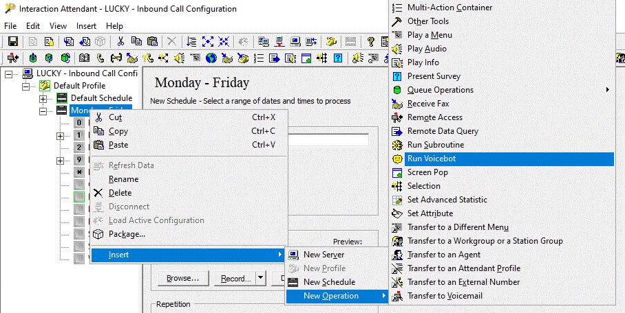 ), or pull down the Insert menu, select New Operation, and finally select Run Voicebot.