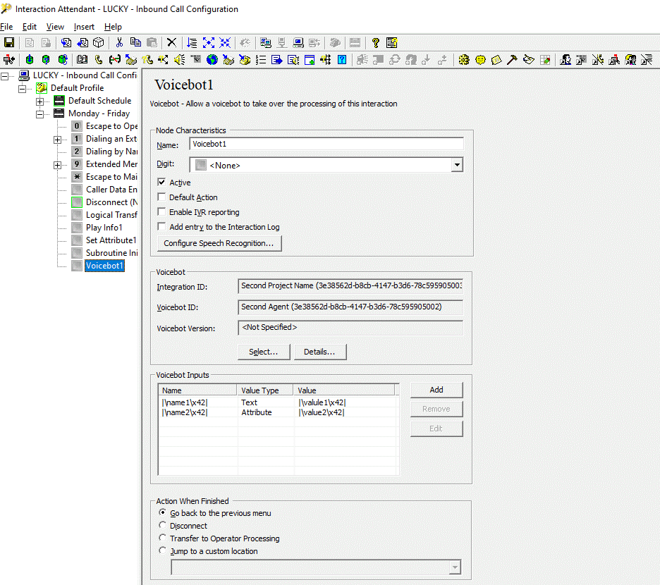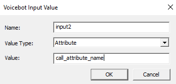 Voicebot Inputs allows specification for a list of input name/value pairs which are sent to the Voicebot at runtime. The value can be either a literal Text string or the name of a call attribute.