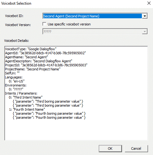 Allows to view the Voicebot information like Voicebot Type, Agent ID, Agent Name, Agent description, Project ID, Project Name, Self Uri, Languages, Environments, and Intents/ Parameters.