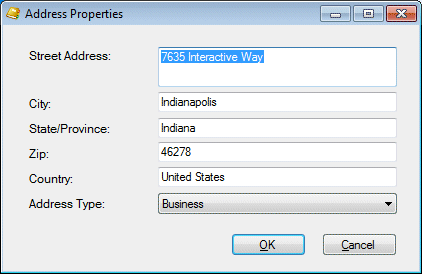 - In the Address Properties dialog box, supply the information for this address. Use the arrow at the end of the Address Type drop-down list to identify the type of address. Click OK.
