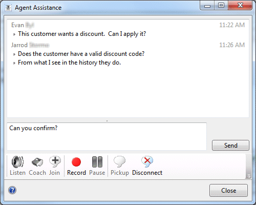 Respond opens the Respond to Assistance Request dialog, to give immediate assistance and feedback to the user. The supervisor can text chat with the agent, and use call action controls to listen, coach, join, record, pause, pickup, or disconnect the interaction.