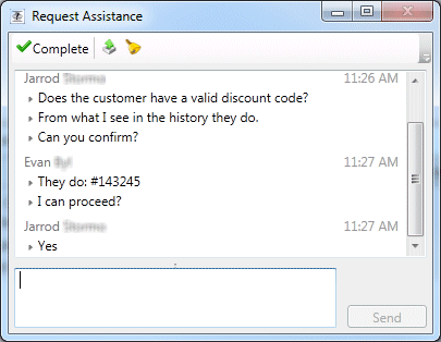 When you click the Assistance button in My Interactions or the Chat Window, the Request Assistance dialog box appears. You enter a problem description and click Send.
