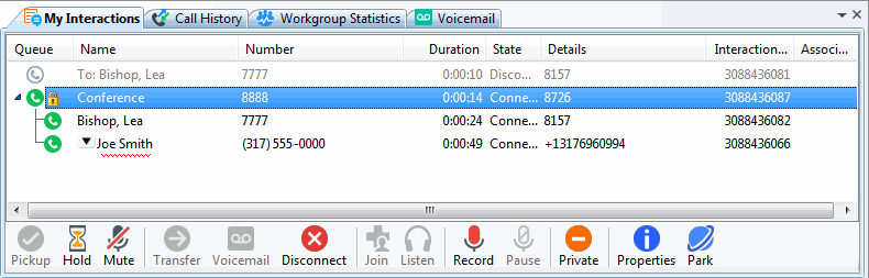 Conference calls appear in the queue views in a tree fashion. The conference call is the root interaction. Click the arrow next to the root interactions to show or hide the conference participants.