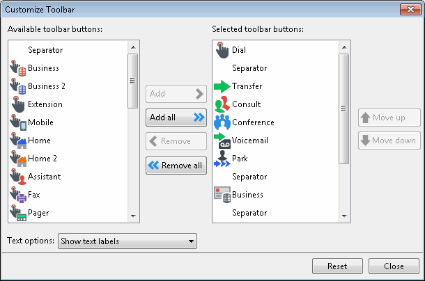 Tip: When you customize a toolbar, pay particular attention when you point to a specific button. Some buttons may have the same label name, but have different icons. For example, the Customize Toolbar dialog box shows three separate Mobile buttons, but one button represents Transfer, one represents Consult, and another represents Dial. Also, some buttons have the same icon but different labels. For more information, see Directory Toolbar Buttons and Using the Queue Control Toolbar.
