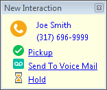 An Interaction Alert appears when you receive a new alerting interaction. The interaction alert dialog box displays information about the interaction, i.e., name, number and an icon for the interaction type. Click Pickup to pick up the interaction, or click Send to Voicemail to send the interaction to your voice mail. |