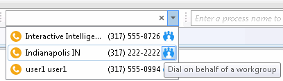Click the Dial on behalf of a workgroup icon in the Enter a name or number to dial search results. If you belong to more than one workgroup, select the appropriate workgroup when prompted.