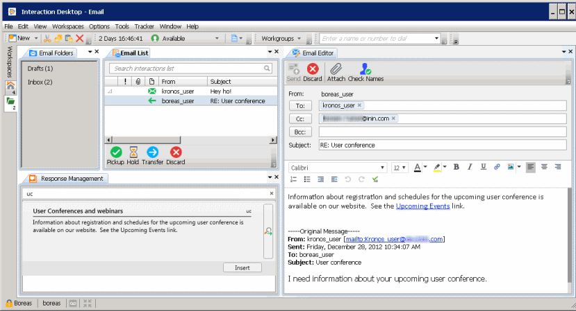 Some default Client Templates combine these views into a single workspace. This workspace can include the Response Management view which enables you to use stored responses in your email replies. If you have the Customize Client Security right, you can add, remove, and rearrange views in an Interaction Desktop workspace. The Email views are available in the Email category in the Create New View dialog box.