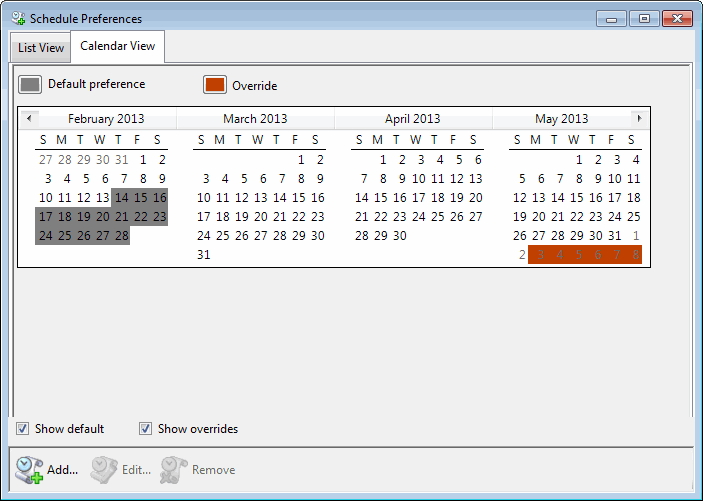 Tip: In either view, select the Show default or Show overrides check box to view one type of preferences at a time or display all schedule preferences by selecting both check boxes.