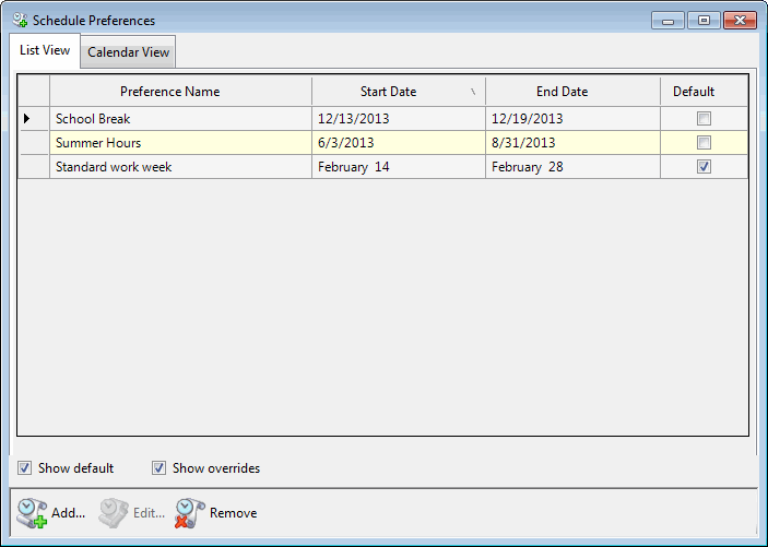 The List View displays a table of your existing schedule preferences. Notice that in the List View, a default preference does not include a year in the Start Date or End Date and the Default check box is selected.