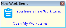 You see a single desktop alert even if you get multiple work items at the same time. The text changes to show how many new work items you have received. Click Open My Work Items to switch to the My Work Items view. Then you can select one work item and click the Pickup button to start processing the work item.