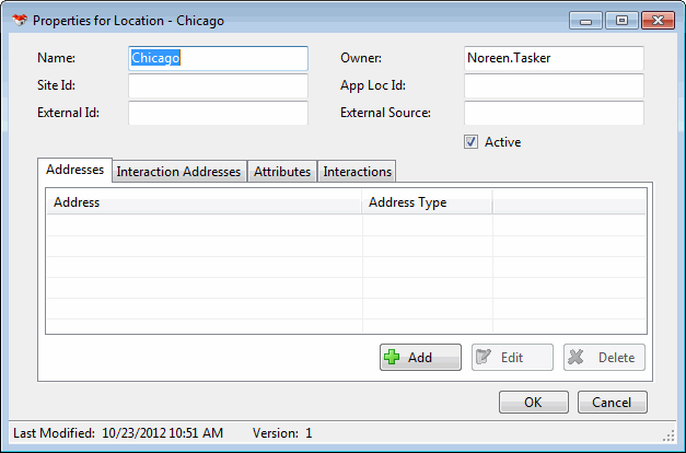 Click Add to add another address for this organization. In the Interaction Address Properties dialog box, supply the information for this address. Use the arrow at the end of the Address Type drop-down list to identify the type of address. When finished, click OK.