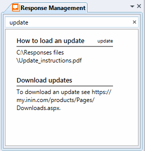 You can use the Response Management view to search for stored responses during any interaction. You can insert these responses in a chat response, email reply, or interaction notes. You can relay the information verbally during a call.