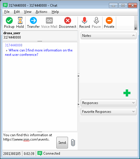 When CIC routes SMS text messages as Chats, you interact with them exactly as you would any other Chat. All the features available when handling a Chat are available to you when handling these SMS text messages. You can invite other CIC users to join the text message conversation, use Response Management to look up answers to frequently asked questions, add notes or codes, and more. See Manage a Chat Session for more details.