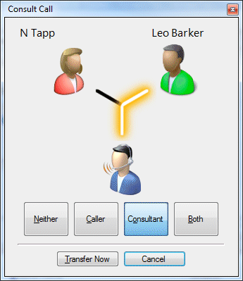 Note: This creates a conference call. You can now speak to both the Caller and the Consultant. If you later complete the transfer, the conference call is replaced by a standard two-party call.